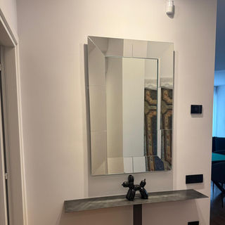 La ristrutturazione ha cambiato la distribuzione interna dei locali: dall'area di ingresso si accede in continuità diretta all'ampio soggiorno, molto luminoso, sia per i toni chiari delle pareti, sia per le ampie finestrature con l'aggiunta delle varie combinazioni di luci artificiali dei faretti e degli strip-led, presenti sia a soffitto sia nelle due nicchie ai lati della tv.